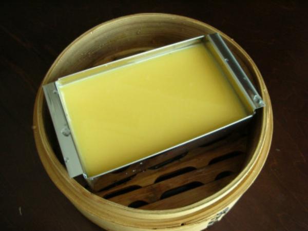 - Tuang larutan ke dalam loyang, lalu kukus dengan api kecil hingga matang, kurang lebih selama 20 menit.